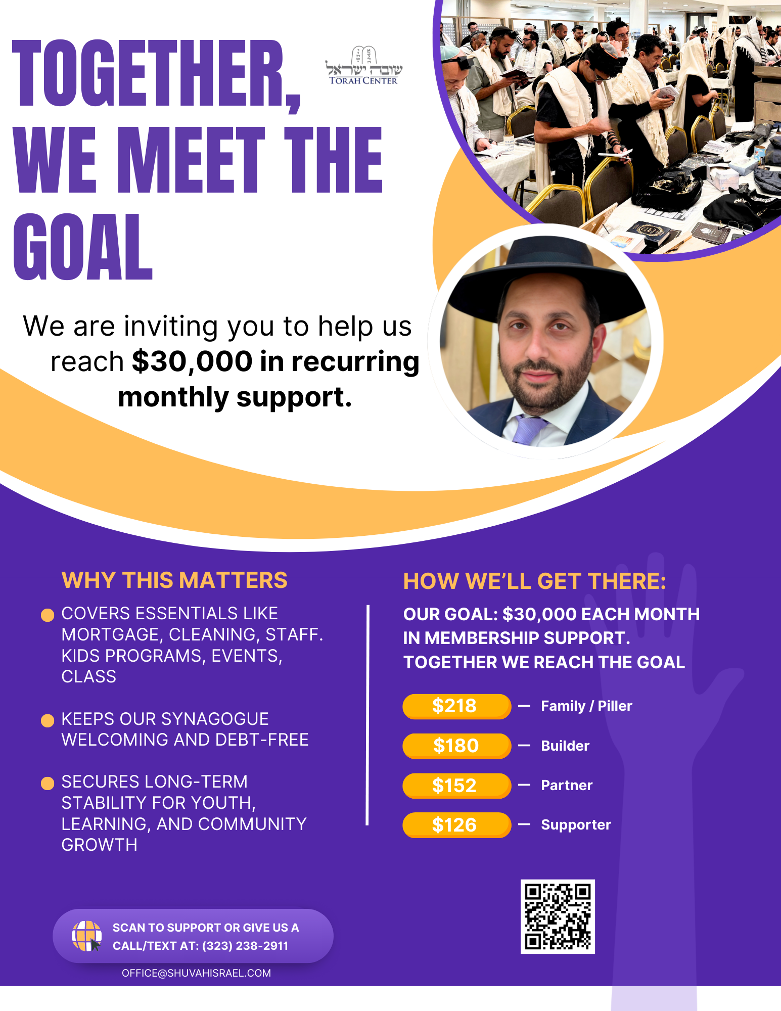 At Shuvah Israel Torah Center we create a community which helps individuals and families with all of their needs in an authentic Sephardic tradition while incorporating Torah, secular education, and midot. We strive and implement the focus of growing and building together to ensure all have a place to stay, a place to place to learn, assistance in finding a shidduch, and a place to connect with Hashem. The most important factor, accepting everyone as they are.